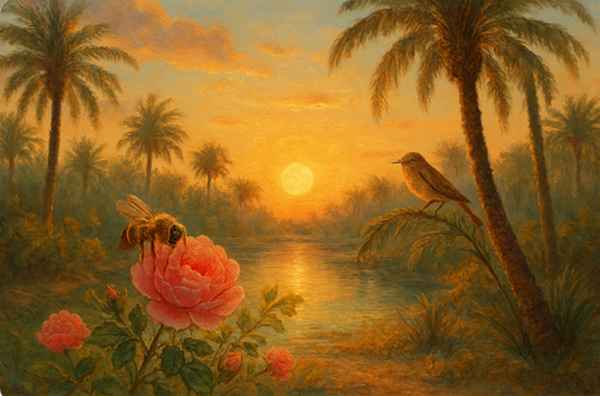 – الشمس تميل والنسيم عليل، الظل ينساب، الوردة تصحو، الطيور تغني، والنحل يرفرف.